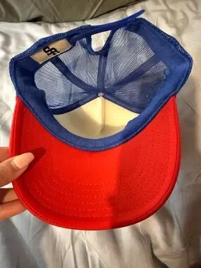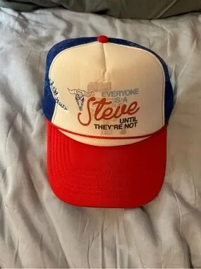 This Stevenson Ranch VIP tour trucker hat by Mike Stud features a red brim and white front panel with "Everyone is a Steve until they're not" text.