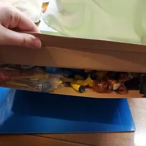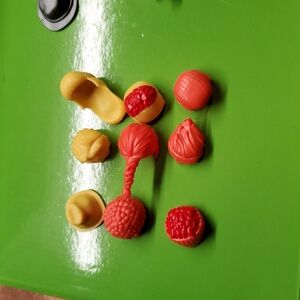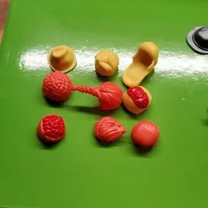There are two accessory sets here. One is a collection of 9 hair/hats in yellow and orange. There is also a set of farming tools. There are six grip pieces that allow the figures to hold the tools and items.