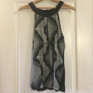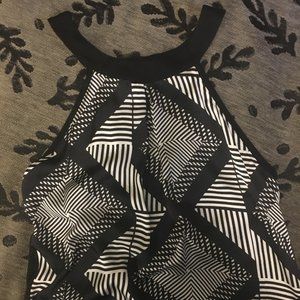 Good preowned condition, tank top blouse by Stile Benetton featuring a geometric black and white pattern. Care label is cut out, so not sure what size or material it is, but measurements are provided below. Possibly a medium. Back fabric feels like a jersey nylon, while the front is a silkier and slinkier fabric (silk or polyester). Great for dancing, partying and would look perfect with some platform shoes.