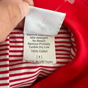 Stitchy Fish boutique brand dress. Long sleeves with red and white stripes. Collared. Smocked detailing of Santa and his Reindeer. Christmas holiday theme.