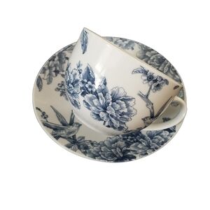 Blue and navy floral retro inspired floral and songbirds design over crispy white base