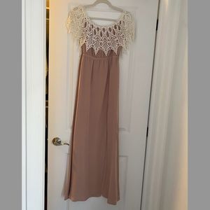Stone Cold Fox Dress with off the shoulder lace detail. Blush and to the floor with slit down the side.