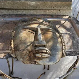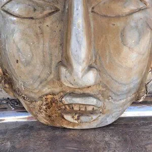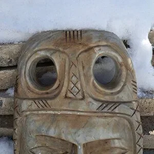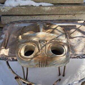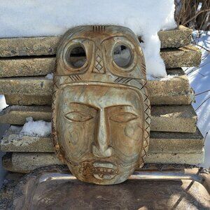 A good sized stone (steatite) Inca mask that most likely originates in Peru. The face bears a fierce expression and a headdress that extends down the sides of the face. There are some scratches so please do consult the pictures. It would be hung from the 2 holes at the top.