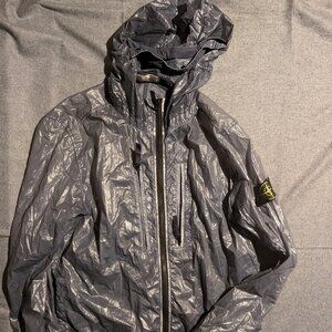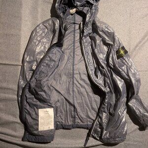 Elevate your outerwear game with this authentic Stone Island packable rain jacket. Perfect for unpredictable weather, this lightweight and stylish jacket features a unique blueish-gray transparent color that adds a modern, edgy vibe to any outfit.