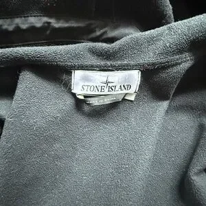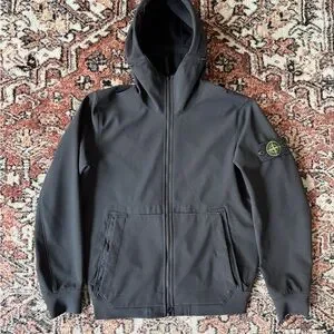 Sleek black windbreaker with hood. Features front pockets and iconic logo patch. Ideal for versatile wear.
