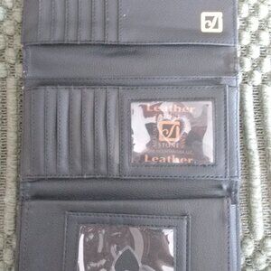 Offering a brown and black leather wallet by Stone Mountain Leather in its original packaging! There are 16 card compartments and 3 compartments that go length-ways. In addition, there is a back flap that has a zipper closure. The front of the wallet has a button closure. There is a compartment available for a cheque book that is removeable if desired.
