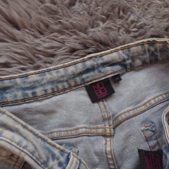 Stone washed women's jeans by No Boundaries size 11.The material is 99% cotton,1% spandex .Made in Bangladesh, inseam is high rise inseam is 27long.The jeans are distressed .Straight leg