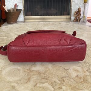 In very good preowned condition attractive red leather shoulder bag from Stone Mountain. Medium-Large capacity it two exterior pockets, zippered top, cloth lined interior with a zippered pocket and two slip pockets. Silver tone hardware and adjustable shoulder strap.