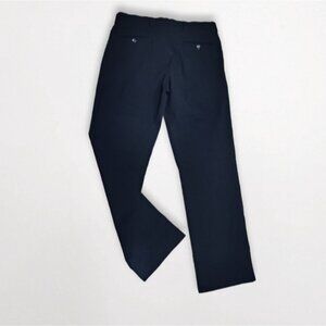 A classic leg trouser with hairline black stripes. Zipper and button closure.