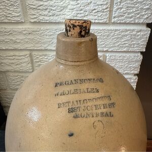 Stoneware Jug- 2 Gal Pegannon & Co WholesaleMontreal Antique 1800's. Cobalt Blue