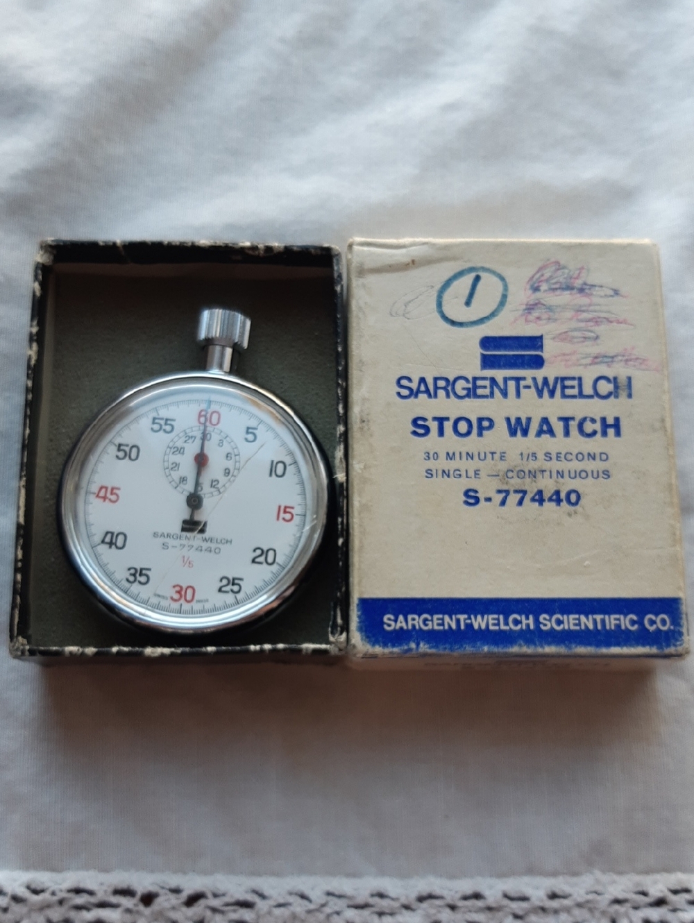 Vintage Sargent Welch Stop Watch S-77440. Made in Switzerland. Works perfectly with a couple scratches as shown in picture.