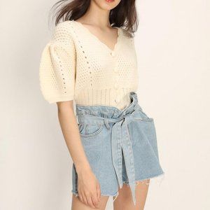 Stunning, delicate and high quality cardigan sweater S/M Cream ivory colour 100% acrylic with a crochet look Button front puff sleeve Short sleeve cinches at the waist Rough measurements laying flat. Note that the material has a lot of give and these were measuring without pulling. Length shoulder down 17” Pit to pit 17.5” Sleeve length 9”
