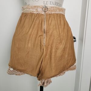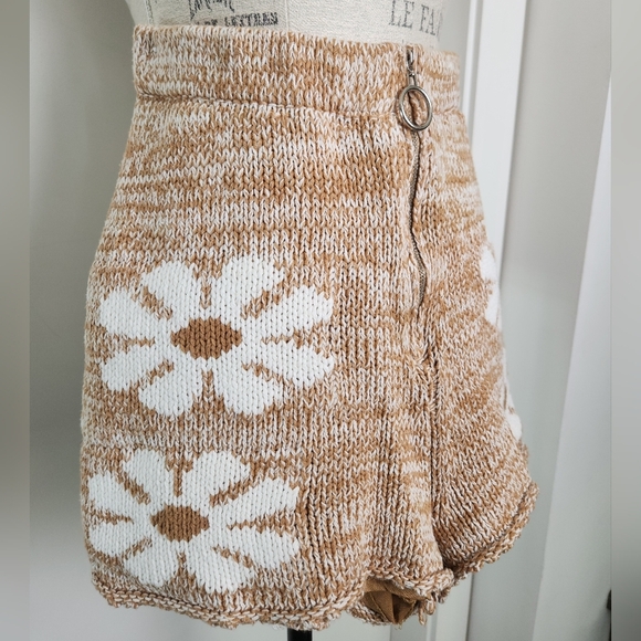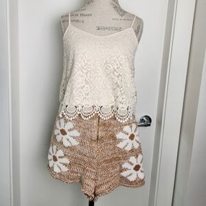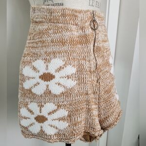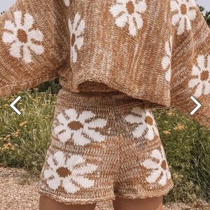 Cozy Caramel Brown & Cream Knit High Waist Shorts with Floral Daisies, by STORIA.