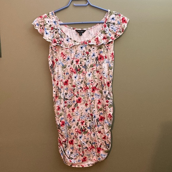 Stork & babe pink floral long tank with frilly top trim. In great shape. It has cinched bottom sides. It is very stretchy material. It says it is small, but it could fit a medium.