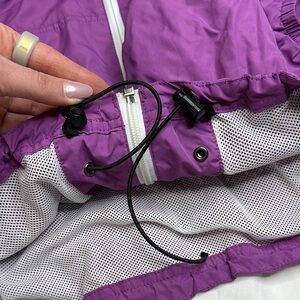 Like new. No rips, stains, tears. Slight damages only on elastic to tighten waist on one side, ball is missing off elastic but doesn’t affect cinching at all. No fading or pilling. Colour is purple.