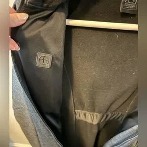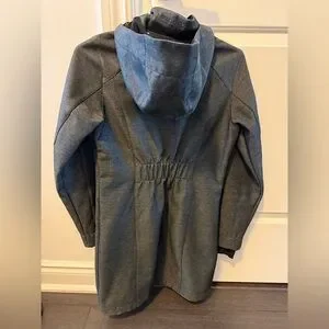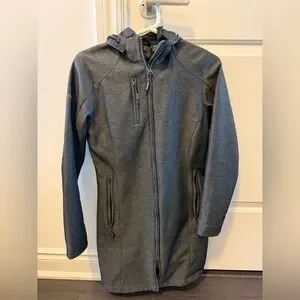 Stormtech fall/winter jacket, size XS, 3/4 length, black/grey blend colour, tapered fit, fleece lining, with thumb holes on sleeves, removable hood, excellent condition, very warm, rain and wind proof, side pockets
