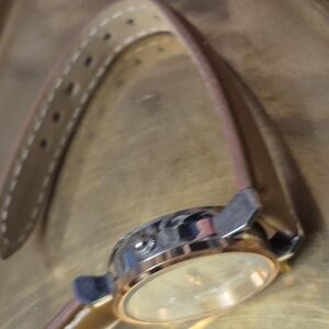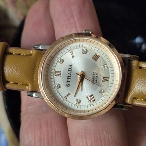 Strada watch rose gold and silver with tan strap and silver accents. in working condition. Needs new batt. Perfect for any occasion.