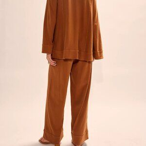 Ready for cooler temps, this set from free-est features a flyaway-style cardigan and wide-leg pants in a heavy cotton jersey with distinct stitching for our signature Strada look. Color is Spice Brown. Size L.