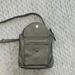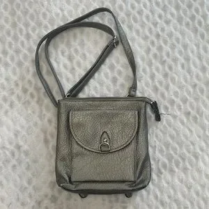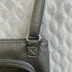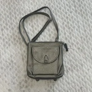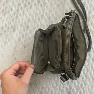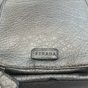 This stylish Strada bag is in excellent condition. This bag features one main compartment with an inside zipper pocket and two additional compartments, a snap pouch with decoration on the front, and a pocket with built in card carrier on the back. The bag is a dark grey colour with a nice leather print. This bag has a sturdy shoulder strap that is connected with metal on both ends.