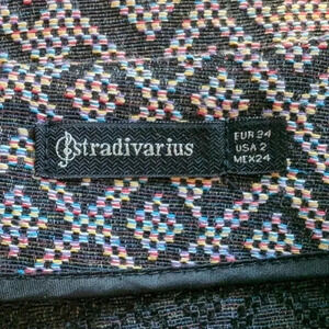 This contemporary skirt by Stradivarius is made of a cotton/polyester blend (58/42) and has a geometric pattern in black on a subtle multicolour background. The skirt has a back zip closure, two pleats at the front, and falls above the knee.