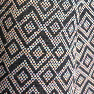 This contemporary skirt by Stradivarius is made of a cotton/polyester blend (58/42) and has a geometric pattern in black on a subtle multicolour background. The skirt has a back zip closure, two pleats at the front, and falls above the knee.