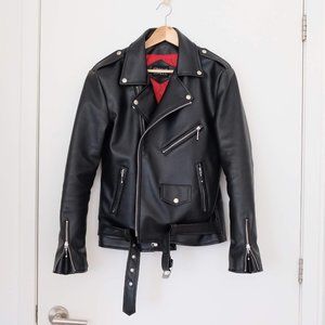 https://straighttohellapparel.com/product/vegan-commando-black-and-nickel/ Wore it for a season before realising it was a bit too tight. It's in good condition and in a smoke free home. Small pin hole in the lapel (pictured). It's fairly warm for a lighter jacket. Straight to Hell's sizing seems to fit a little bit small, IMO, just be aware when estimating fit. Will be mailed in the original garment bag.