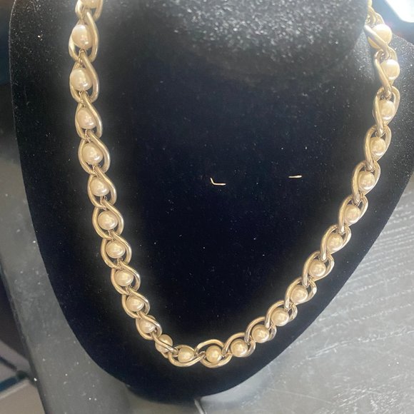 This beautifully designed necklace has a silver chain interwoven through each pearl. Unusual design.