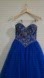 Elegant strapless gown in vibrant blue. Features intricate sequin embellishments on the bodice. Perfect for formal occasions.