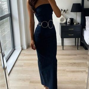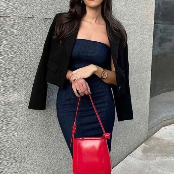 This dark blue denim midi dress is a must-have for 2024 spring fashion. The dress features a stylish zipper and split design, adding a touch of elegance to any evening occasion. The strapless and backless style makes it perfect for showing off your curves, while the zipper closure ensures a secure fit. The dress is versatile and can be dressed up or down for any event.