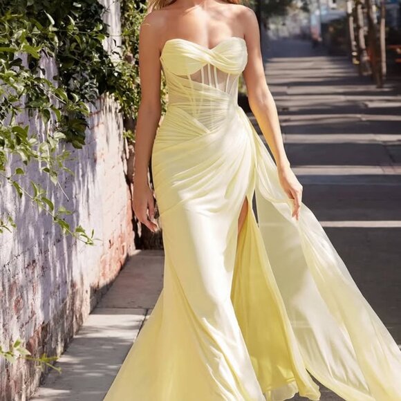 Stand out in style with this stunning Norma Reed light yellow prom dress—the only one of its kind at the banquet hall! I received countless compliments on its unique design and elegant fit.