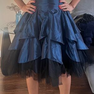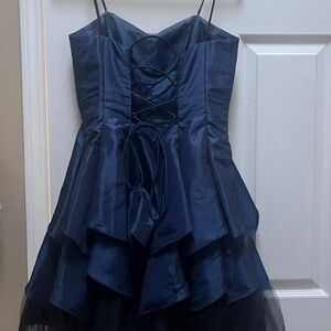 A cute strapless dress with a corset style tie in the back. Great for formal wear or grad. Normally I’m a size 0 but it fits