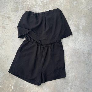 Strapless Overlay Black Short Style Jumpsuit with Pockets and Elastic Waist