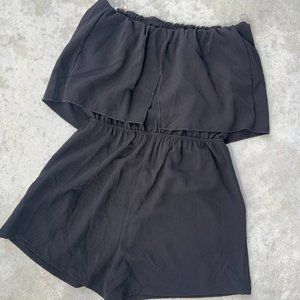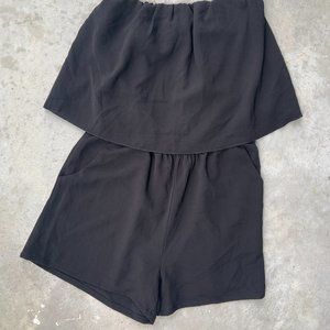Strapless Overlay Black Short Style Jumpsuit with Pockets and Elastic Waist and Top, clear inside straps to easily hang, cute V "opening" in the back, very comfortable and pull over style , Made in the USA
