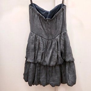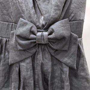 Tiered balloon style strapless occasion dress with bow at the waist and concealed zipper in the back. Fabric has slight shimmer.