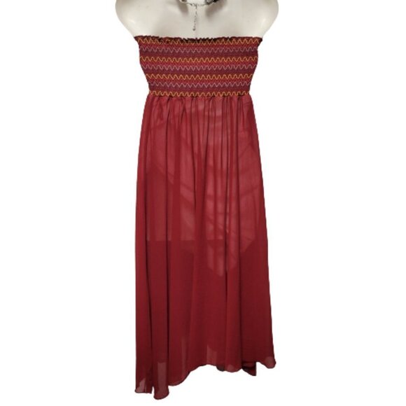 Strapless Burgundy Red Flowy Midi Smocked Dress