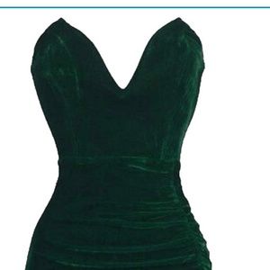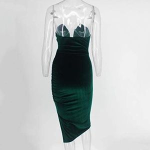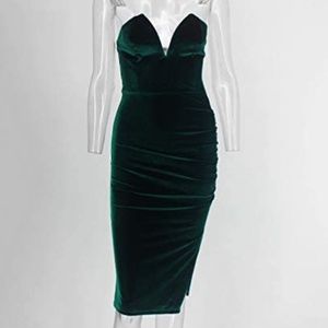 Green Strapless Ruched Velvet Split Sexy Bodycon Midi Dress