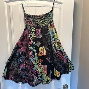 Cute, short little strapless sundress. The top is stretchy, like a tube top. Overall length is 29". Tag says size is large. The top measures 24" around but stretches up to about 30" around. Brand is Santiki.