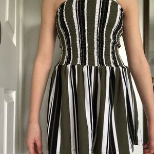 It’s a strapless romper with green white and black stripes. Size small in women’s