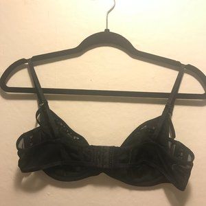 Size 36B strappy, black Intimately - Free People bra. This is an unpadded, underwire bra. Cups are black mesh with a checked mesh overtop. Shoulder straps are adjustable.