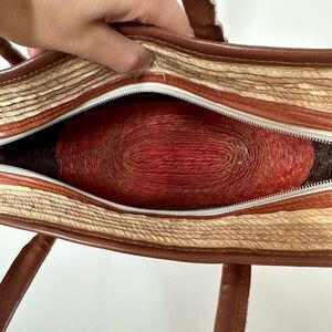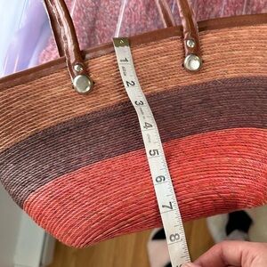 Straw Woven Handbag Zipper close Coral, chocolate, and light brown colour blocking stripes No flaws, but the handles have a raw edge on them, some light wear