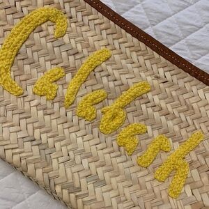 Straw bag clutch purse zippered top yellow tassel pull yellow graphic CELEBASH 14”x 93/4”. Ivory colour straw with brown trim around closure. Excellent barely used condition