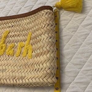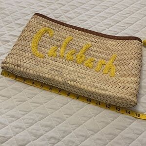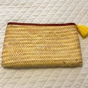 Straw bag clutch purse zippered top yellow tassel pull yellow graphic CELEBASH 14”x 93/4”. Ivory colour straw with brown trim around closure. Excellent barely used condition
