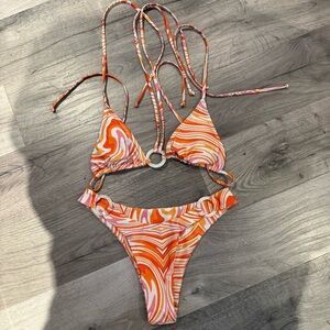 Make waves in this bold and rare Strawberry Milk Mob bikini set. Featuring a vibrant retro swirl print in fiery orange, coral, and pink, this two-piece comes with a classic triangle top and high-cut bottoms — both accented with chic resin rings for that perfect 70s revival look.