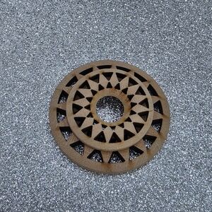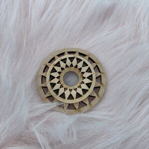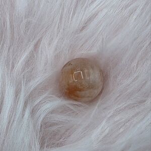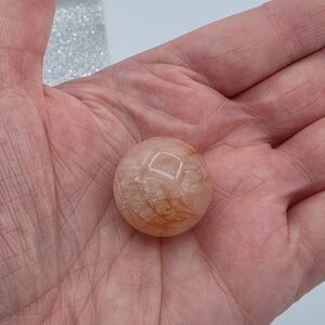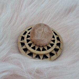 Strawberry quartz sphere with a wooden stand composed of three concentric circular layers, each with triangular cutouts. Strawberry quartz is a rare variety of quartz, getting its pinkish-red color from iron oxide inclusions. It is believed to have metaphysical properties, including promoting self-esteem, removing negativity, and balancing the body, mind, and spirit. It is also used in healing ceremonies and to stimulate recall. Sphere is approximately 1" in diameter & stand is approximately 2.5" wide.