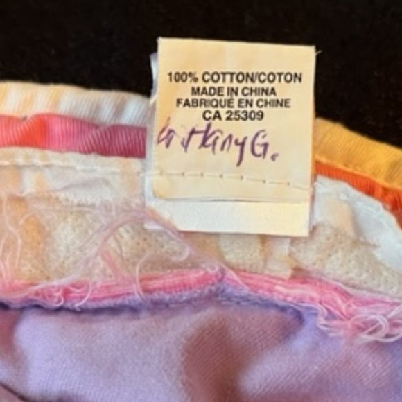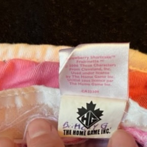 Strawberry Shortcake Girls Bucket Hat in very good pre-loved condition. Hat is light mauve in colour with pink strawberries and mauve flowers around the brim. Hat features strawberry shortcake with her cat Custard on one side. Hat does not have a size tag, approximate size is Girls 4-6. 100% cotton. Vintage hat from 2006. Has name written on tag. Hat has a small section that was hand sewn, see last picture for details. Colour depends on device/screen settings and lighting in pictures.