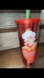 Red glitter tumbler featuring Strawberry Shortcake design. Comes with a green straw.