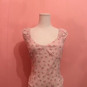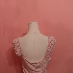 Light pink top with delicate strawberry pattern. Features cap sleeves and scoop neckline. Size large.