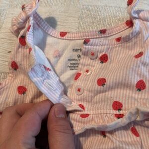 Cute strawberry romper with buttons at the top and snaps at the bottom