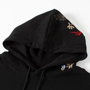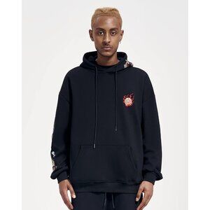 Japanese streetwear heavyweight hoodie cut in relaxed fit silhouette. It is beautifully sewn and gorgeous all around. It is made from preshrunk cotton and the fabric is pill-resistant with high-stitch density for durability. The super soft fleece inner layer can trap heat to keep you warm in cold winter. Pullover style with an adjustable hood, kanga pocket and ribbed knit trims. Finished with embroidered fire dragon graphic on the sleeves and hood.