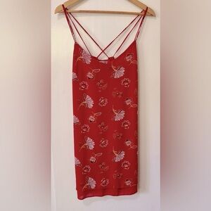 Pretty red Streetwear Society dress with floral pattern. Features delicate spaghetti straps and cross back. Size medium.